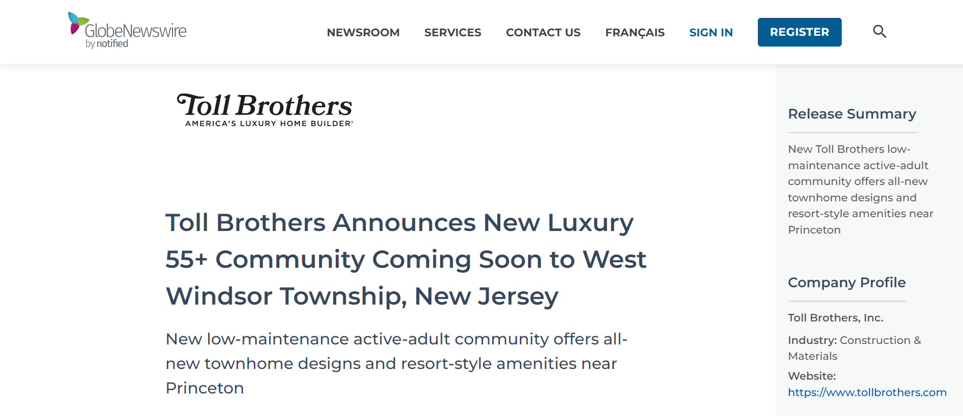 The release, Toll Brothers Announces New Luxury 55+ Community Coming Soon to West Windsor Township, New Jersey, concisely puts everything a journalist would need to know right in the headline, grabbing attention and clearly communicating the story.