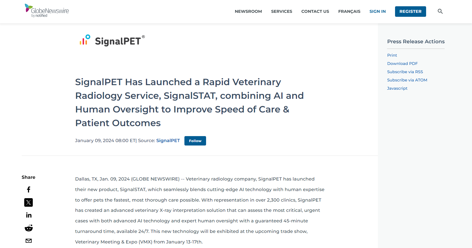 - The headline, "SignalPET Launches SignalSTAT: Rapid Veterinary Radiology Service with AI and Human Oversight," makes it clear that they want to improve the speed of care for animals.