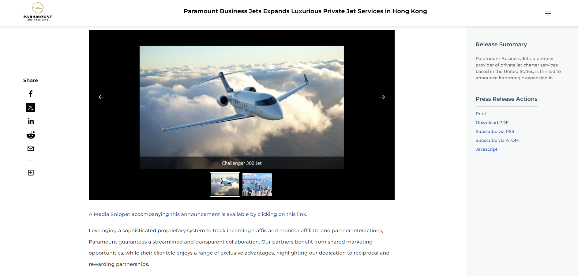 Paramount Business Jets Expands Luxurious Private Jet Services in Hong Kong